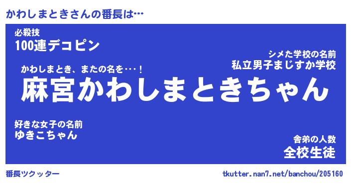 | ヒーロー風カッコイイあだ名 | 『スーパーカワシマトキ』『暗黒騎士カワ』 |