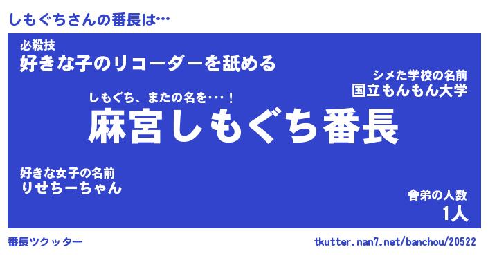 | 意味不明あだ名 | 『ペロリンしもぐち』『永久保存しもぐち』 |