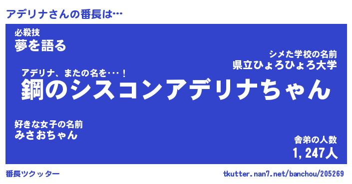 | 意味不明あだ名 | 『ペロリンアデリナ』『永久保存アデリナ』 |