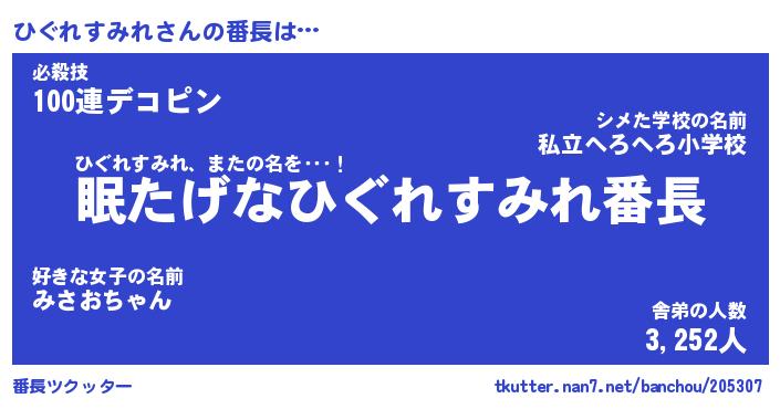 | ヘコむあだ名 | 『ひぐっふぃ~』『つくし』 |