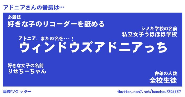 | 意味不明あだ名 | 『ペロリンアドニア』『永久保存アドニア』 |