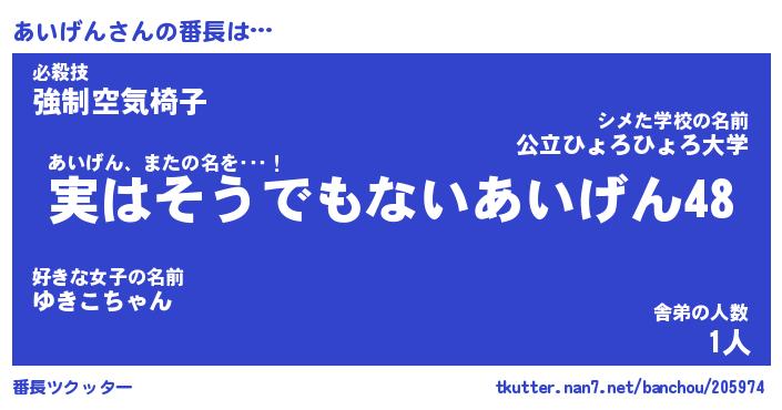 | 意味不明あだ名 | 『ペロリンあいげん』『永久保存あいげん』 |