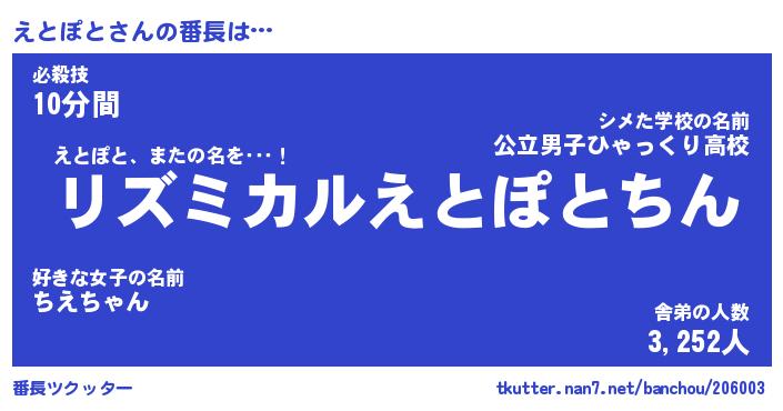 | 意味不明あだ名 | 『ペロリンえとぽと』『永久保存えとぽと』 |