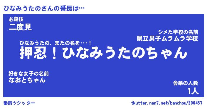 | 男性向けラノベタイトル風あだ名 | 『ヒナミウタノアートオンライン』 |