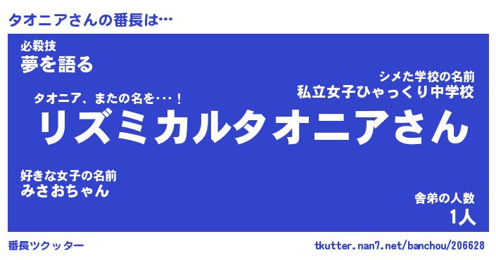 | 男性向けラノベタイトル風あだ名 | 『タオニアの憂鬱』 |