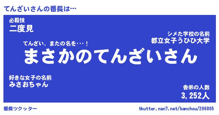 | 意味不明あだ名 | 『ペロリンてんざい』『永久保存てんざい』 |