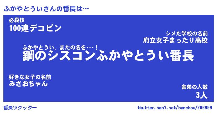 | ヒーロー風カッコイイあだ名 | 『スーパーフカヤトウイ』『魔戒騎士フカ』 |