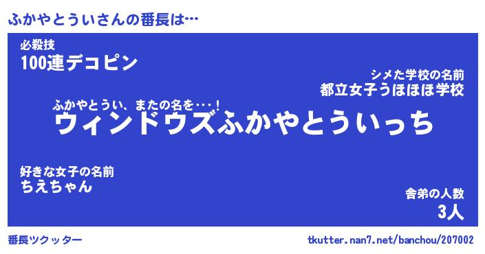 | ポケモン風あだ名 | 『フカチュウ』『フカヤダネ』 |