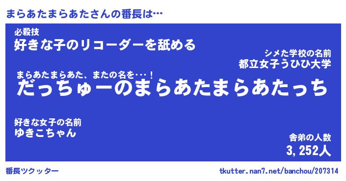 | ピコ太郎風あだ名 | 『マコ一郎』『ピマ三郎』『マラ十郎』 |