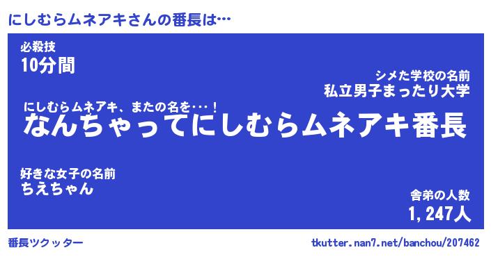 | 肩書あだ名 | 『にしむらムネアキ店長』 |