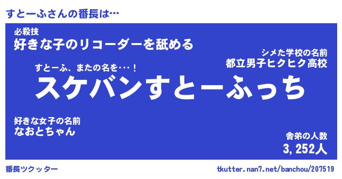 | 意味不明あだ名 | 『ペロリンすとーふ』『永久保存すとーふ』 |