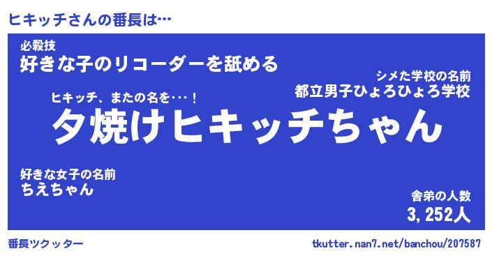 | 意味不明あだ名 | 『ペロリンヒキッチ』『永久保存ヒキッチ』 |
