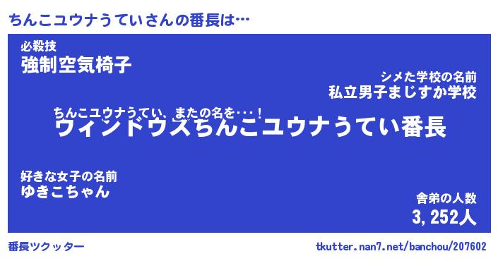 | 男性向けラノベタイトル風あだ名 | 『ちんこユウナうていの憂鬱』 |