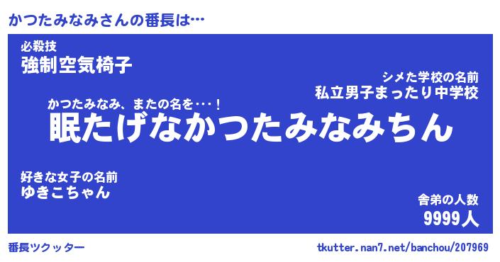 | 伝説のあだ名 | 『封印されしスナイパーかつたみなみ』 |