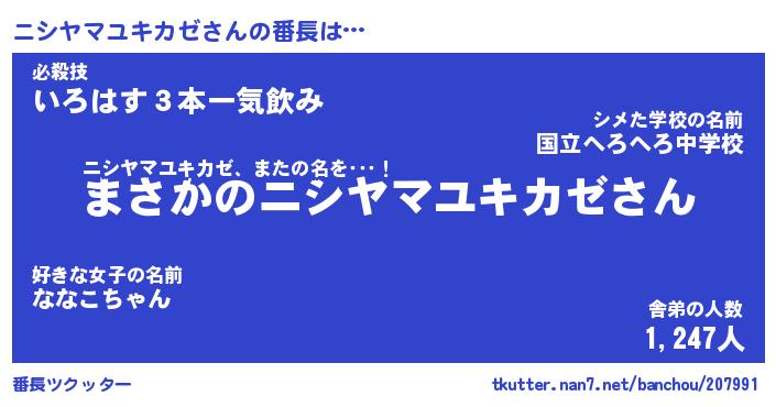 | 肩書あだ名 | 『ニシヤマユキカゼ社長』 |