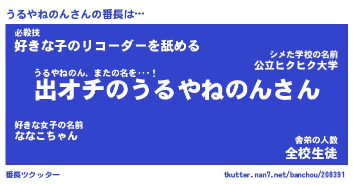 | 男性向けラノベタイトル風あだ名 | 『うるやねのんの憂鬱』 |