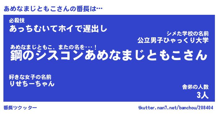| ツイッター | あめなまじともこさんのツイッターID『namakemono_man』 |