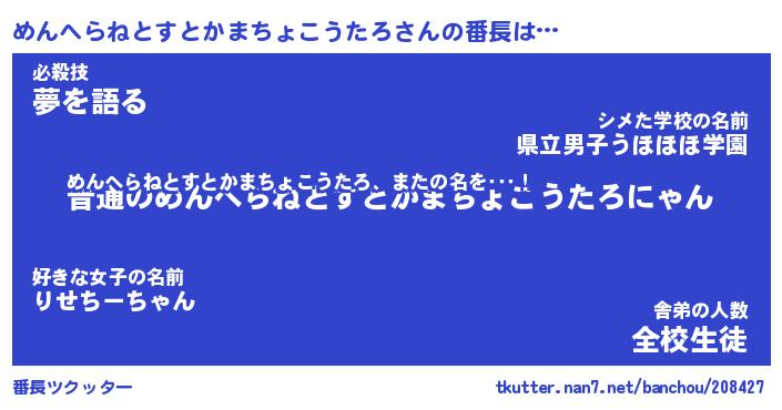 | 学校 | めんへらねとすとかまちょこうたろ校長が勤める学校の名前『国立男子メラメラ中学校』 |