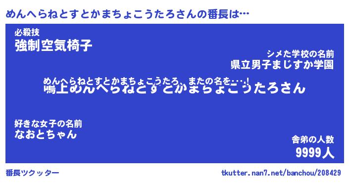| 伝説のあだ名 | 『封印されしスナイパーめんへらねとすとかまちょこうたろ』 |