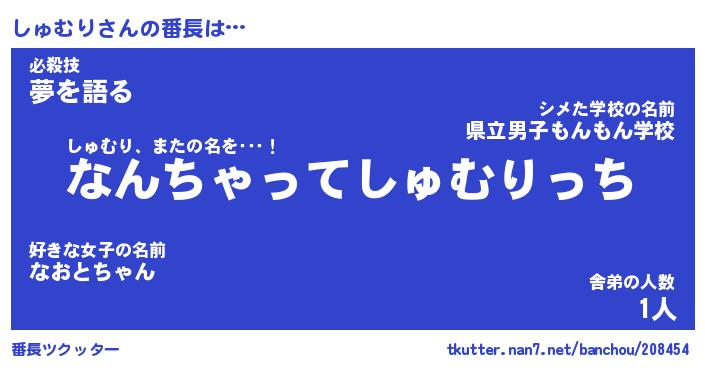 | 伝説のあだ名 | 『伝説のスナイパーしゅむり』 |