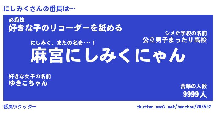 | 肩書あだ名 | 『にしみく社長令嬢』『にしみく国家主席』 |