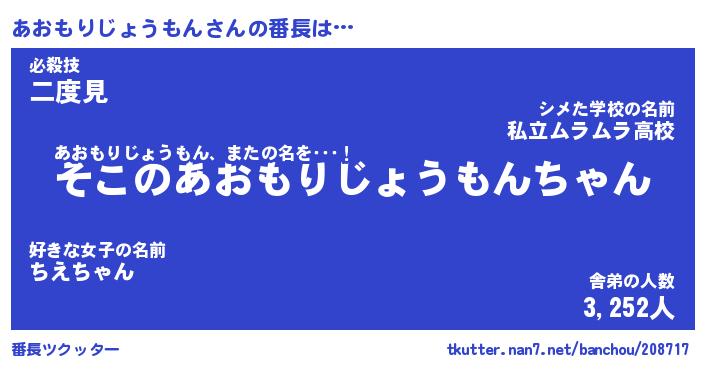 | 男性向けラノベタイトル風あだ名 | 『あおもりじょうもんの憂鬱』 |