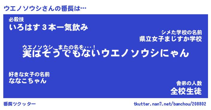 | ピコ太郎風あだ名 | 『ウコ太郎』『ピウ八郎』『ウエ六郎』 |