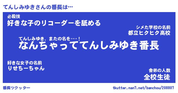 | ヘコむあだ名 | 『てんにー』『なまこ酢』『てんお』 |