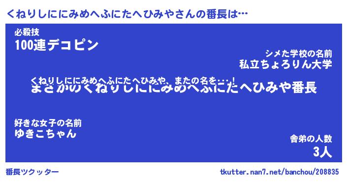 | 肩書あだ名 | 『くねりしににみめへふにたへひみや社長』 |