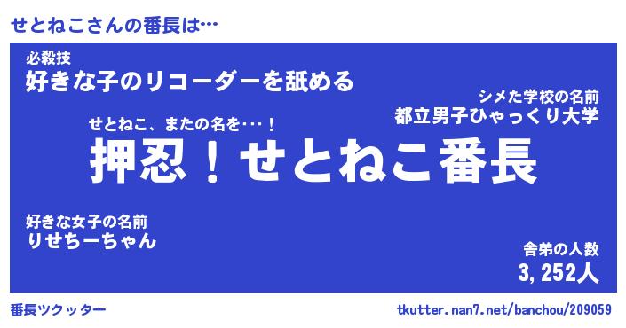 | 意味不明あだ名 | 『ペロリンせとねこ』『永久保存せとねこ』 |