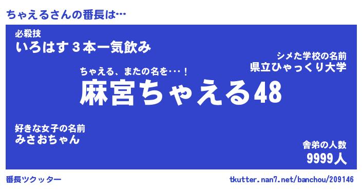 | 意味不明あだ名 | 『ペロリンちゃえる』『永久保存ちゃえる』 |