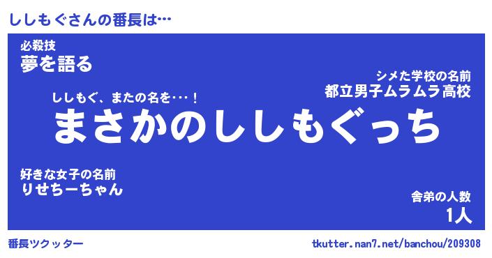| 男性向けラノベタイトル風あだ名 | 『ししもぐの憂鬱』 |
