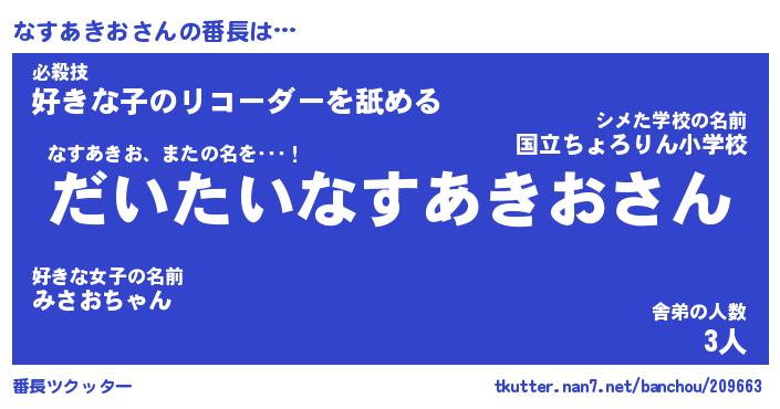 | ヒーロー風カッコイイあだ名 | 『スーパーナスアキオ』『魔戒騎士ナス』 |