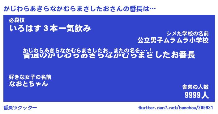 | ヒーロー風カッコイイあだ名 | 『スーパーカジワラアキラナカムラマサシタオ』 |