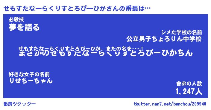 | 男性向けラノベタイトル風あだ名 | 『せもすたなーらくりすとろびーひかの憂鬱』 |
