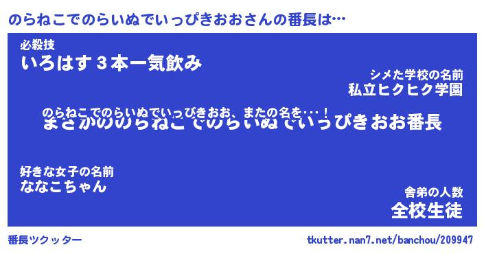| ヒーロー風カッコイイあだ名 | 『スーパーノラネコデノライヌデイッピキオオ』 |
