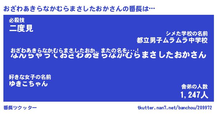| ツイッター | おざわあきらなかむらまさしたおかさんのツイッターID『renkon_nyan』 |