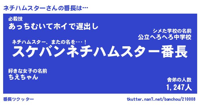 | 男性向けラノベタイトル風あだ名 | 『ネチハムスターアートオンライン』 |