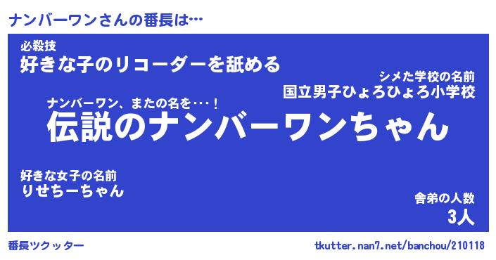 | ヒーロー風カッコイイあだ名 | 『スーパーナンバーワン』『幻影騎士ナン』 |