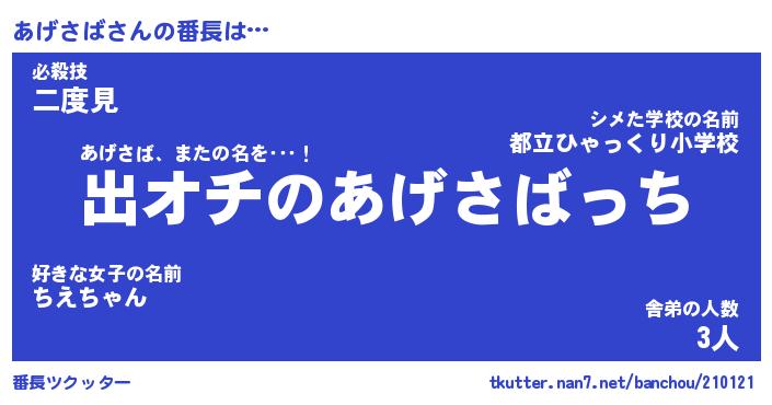 | 伝説のあだ名 | 『伝説のスナイパーあげさば』 |