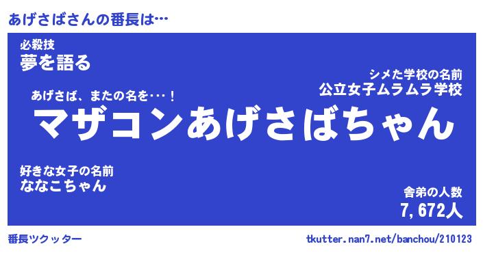 | 意味不明あだ名 | 『ペロリンあげさば』『永久保存あげさば』 |