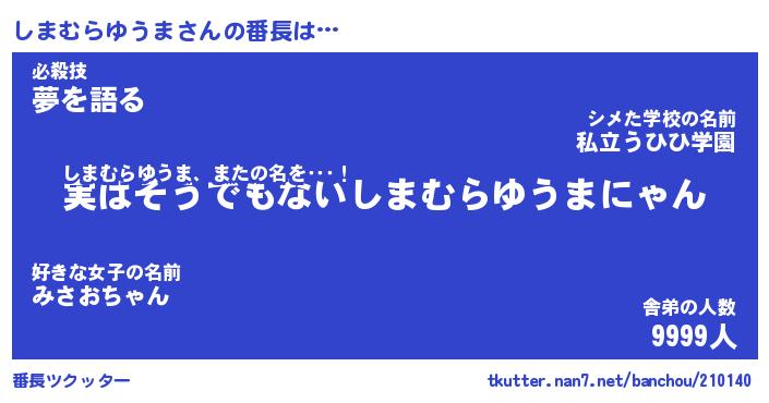 | 恥ずかしいあだ名 | 『プリティーしまむらゆうま』『しまちん』 |