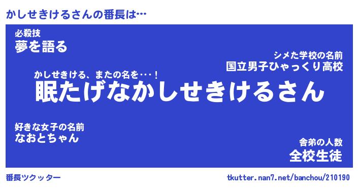 | 伝説のあだ名 | 『封印されしスナイパーかしせきける』 |