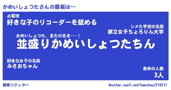 | 2回繰り返すあだ名 | 『かめかめ』『かかめめ』『おやおや』 |