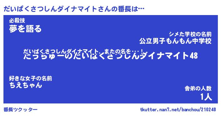 | 男性向けラノベタイトル風あだ名 | 『だいばくさつしんダイナマイトの憂鬱』 |