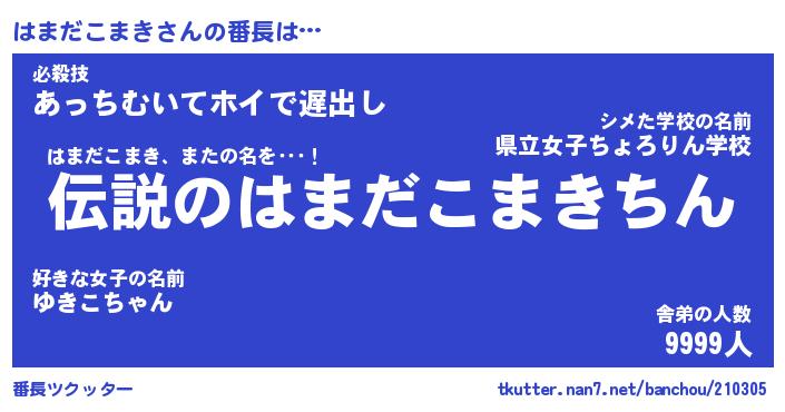| 猫の名前『はまだこまきにゃん』性別『雄』 |