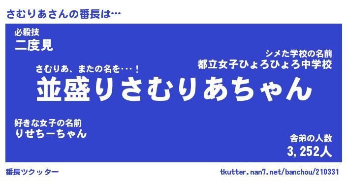 | 意味不明あだ名 | 『ペロリンさむりあ』『永久保存さむりあ』 |