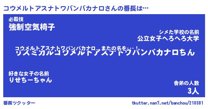 | ヒーロー風カッコイイあだ名 | 『スーパーコウメルトアスナトワバンバカナロ』 |