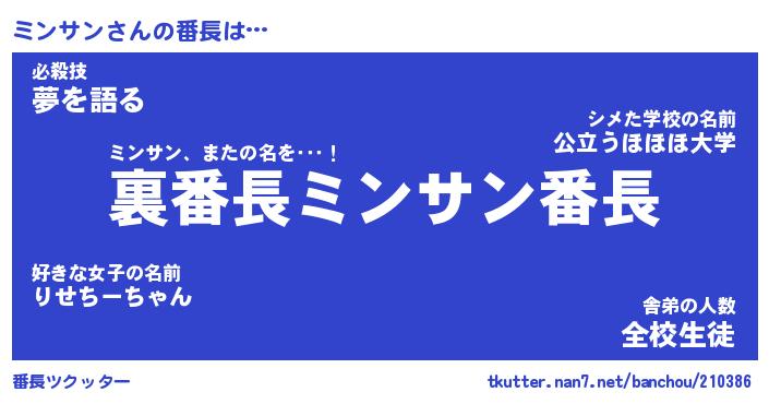 | ヒーロー風カッコイイあだ名 | 『スーパーミンサン』『暗黒騎士ミン』 |