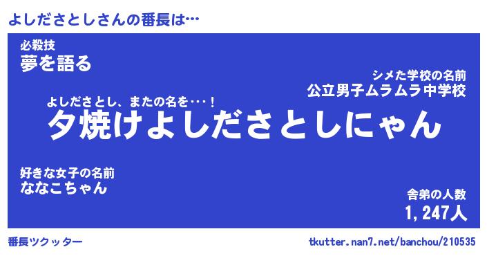 | ヒーロー風カッコイイあだ名 | 『スーパーヨシダサトシ』『暗黒騎士ヨシ』 |